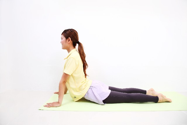 足を伸ばし、うつ伏せで寝転びます。胸の脇に両手を置き、下半身は床に着けたまま上体をゆっくりと起こしましょう。