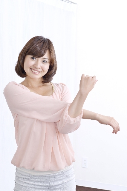 片方の肘を上げ、もう片方の手で反対側に引っ張ります。反対側も同様に。脇腹も伸ばせます。
