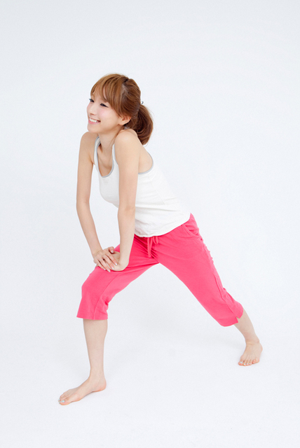 立った状態で腰よりやや高い位置のバー等に片方の足首を乗せ、膝をゆっくりと押します。この時かけている方のつま先を手前に引き、足の裏が天井に見えるようにしましょう。反対側の足のつま先は外側に。左右の足を同様に行います。背中や腰も伸ばせます。